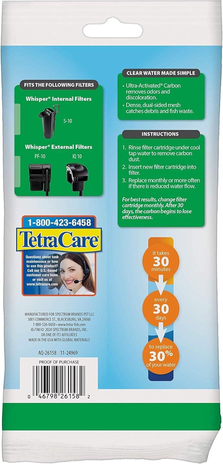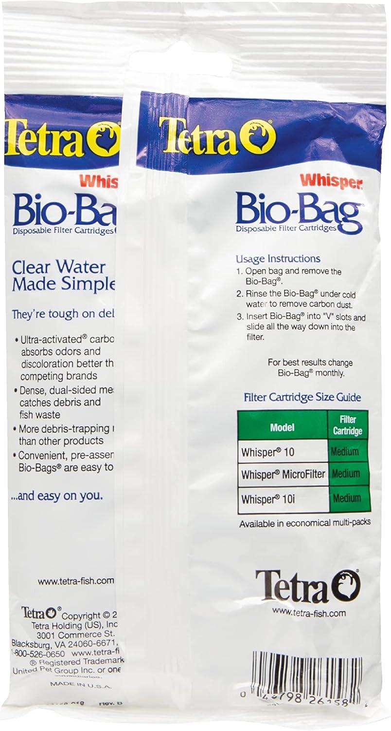 Tetra® Bio-Bag® Filter Cartridge with Stay Clean™ technology keeps aquarium water clean and clear. This filter’s dual-sided floss sleeve removes dirt and debris and contains Ultra-Activated® carbon to remove odor and discoloration. Its integrated design also includes a Stay Clean tablet that dissolves steadily over time, leaving you with healthier water and cleaner aquarium glass. Stay Clean technology helps reduce buildup on aquarium glass, bind small dirt particles to make them easier to filter and stabilize pH levels to prevent crashes – meaning easier aquarium maintenance for you. Tetra Bio-Bag Filter Cartridges are compatible with Tetra Bio-Bag aquarium filters – each package is color-coded to make it simple to remember which size to purchase. These replacement filters are assembled and ready to use for your convenience. This medium-size filter cartridge fits Tetra Whisper® 10i Internal Filter, Whisper PF10 Power Filter and Whisper IQ10 Power Filter. For best results, change your filter cartridge monthly or sooner if needed. Since 1951, Tetra has developed the world’s most comprehensive body of fish food knowledge, and fishkeeping enthusiasts have looked to the brand for products and solutions that add ease and beauty to their home. Whether you're an experienced hobbyist or just starting out, Tetra has everything you need – from a large variety of quality fish food and innovative equipment to test kits and decor.