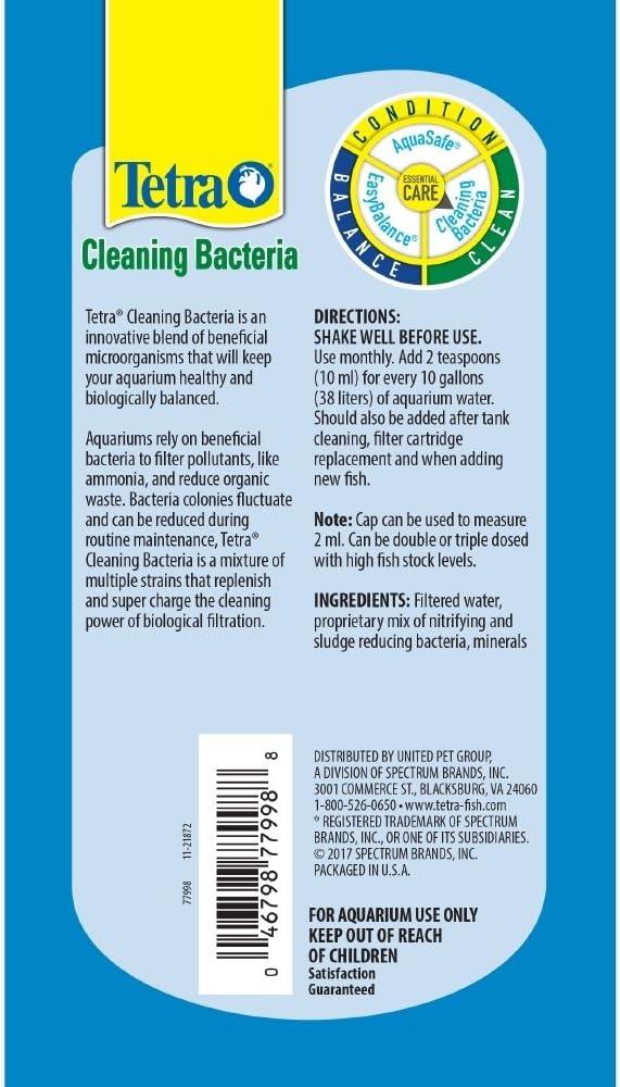 Aquariums rely on beneficial bacteria to filter pollutants, like ammonia, and reduce organic waste. Tetra Cleaning Bacteria is an innovative blend of beneficial microorganisms that will keep your aquarium healthy and biologically balanced. Bacteria colonies fluctuate and can be reduced during routine maintenance. This formula contains a mixture of multiple strains that replenish and supercharge the cleaning power of biological filtration. It cleans gravel, removes sludge, and removes ammonia from your tank. Use Tetra Cleaning Bacteria monthly. Add 2 teaspoons (or 10 milliliters) for every 10 gallons of aquarium water. Also add to aquarium water after every tank cleaning, filter cartridge replacement and when adding new fish. For aquarium use only. Since 1951, Tetra has developed the world’s most comprehensive body of fish food knowledge, and fishkeeping enthusiasts have looked to the brand for products and solutions that add ease and beauty to their home. Whether you're an experienced hobbyist or just starting out, Tetra has everything you need–-from a large variety of quality fish food and innovative equipment to test kits and decor.