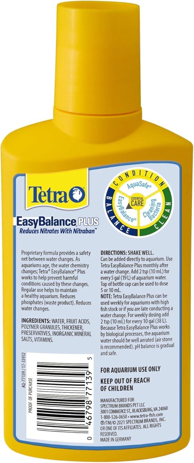 Tetra® EasyBalance® Plus works to maintain healthy levels of essential aquarium water chemistry necessary to keep your fish happy and healthy. This easy-to-use formula regulates pH and alkalinity and reduces nitrates and phosphates. At the same time, Tetra EasyBalance Plus replenishes essential vitamins, minerals and electrolytes for maximum aquarium health. One teaspoon treats 5 gallons of aquarium water. Regular use of EasyBalance Plus reduces the need for water changes for up to 6 months. Use EasyBalance Plus weekly to maintain healthy aquarium conditions. Shake well before using. The top of the supplied screw cap can be used for measuring. Fill to inner ring line (5 mL or 1 teaspoon) to treat 5 gallons or use the full cap (10 mL) for 10 gallons. This product should not be used in aquariums with low oxygen conditions; proper aeration using an airstone is recommended. A properly maintained aquarium contains the correct stocking level of fish, aeration, proper filtration and regular testing. Since 1951, Tetra has developed the world’s most comprehensive body of fish food knowledge, and fishkeeping enthusiasts have looked to the brand for products and solutions that add ease and beauty to their home. Whether you're an experienced hobbyist or just starting out, Tetra has everything you need–-from a large variety of quality fish food and innovative equipment to test kits and decor.