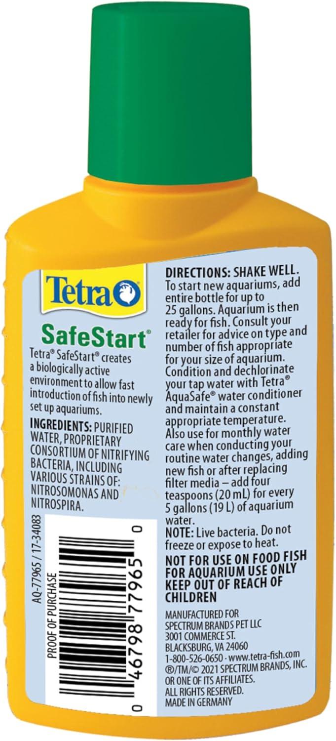 Tetra is a name you can trust in the aquatics industry. With decades of proven performance and high quality products it’s no wonder Tetra is the go to brand for aquatics beginners and veterans alike. Create a safe environment for your fish by adding Tetra Safe Start. It is most effective when you are setting up a tank for the first time or adding new fish to its population. Using healthy filter bacteria, the formula works to remove ammonia and nitrite. This helps your aquatic pets thrive and grow properly. The Tetra SafeStart solution accelerates the establishment of the Bio Filter in a new aquarium. It can also be used after a water change, when adding new fish or after medicating. SafeStart contains unique bacteria and is proven to reduce fish loss due to ammonia and nitrate toxicity. Inside this bottle is 3.38 oz of aquarium safe start, enough to treat 100 gallons of water.