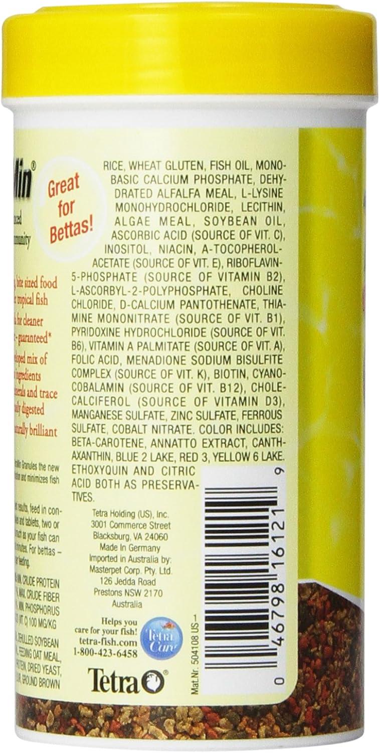Tetra TetraMin Tropical Granules are a nutritionally balanced complete diet for optimal health in mid-level-feeding tropical aquarium fish as well as small juvenile or shy fish These slow-sinking bite-sized granules are fortified with Vitamin C and make an ideal staple food for bettas The scientifically developed mix of highly nutritious ingredients plus vitamins minerals and trace elements is easily digested and enhances your fish’s naturally brilliant colors Compared with previous formulations of Tetra TetraMin Tropical Granules this formula improves food utilization and minimizes fish waste for cleaner and clearer water For best results feed in conjunction with Tetra TetraMin flakes and tablets Feed two to three times daily only as much as your fish can consume within three minutes For bettas feed only a few granules per feeding Since 1951 Tetra has developed the world’s most comprehensive body of fish food knowledge and fishkeeping enthusiasts have looked to the brand for products and solutions that add ease and beauty to their home Whether you're an experienced hobbyist or just starting out Tetra has everything you need – from a large variety of quality fish food and innovative equipment to test kits and decor