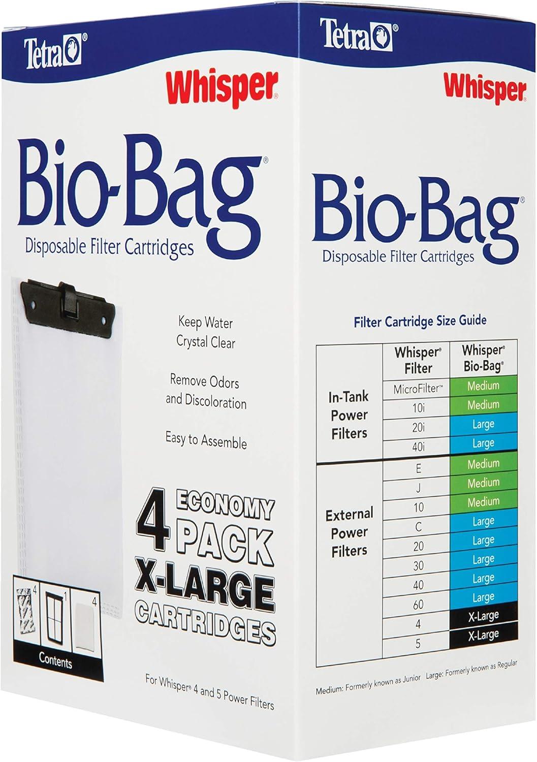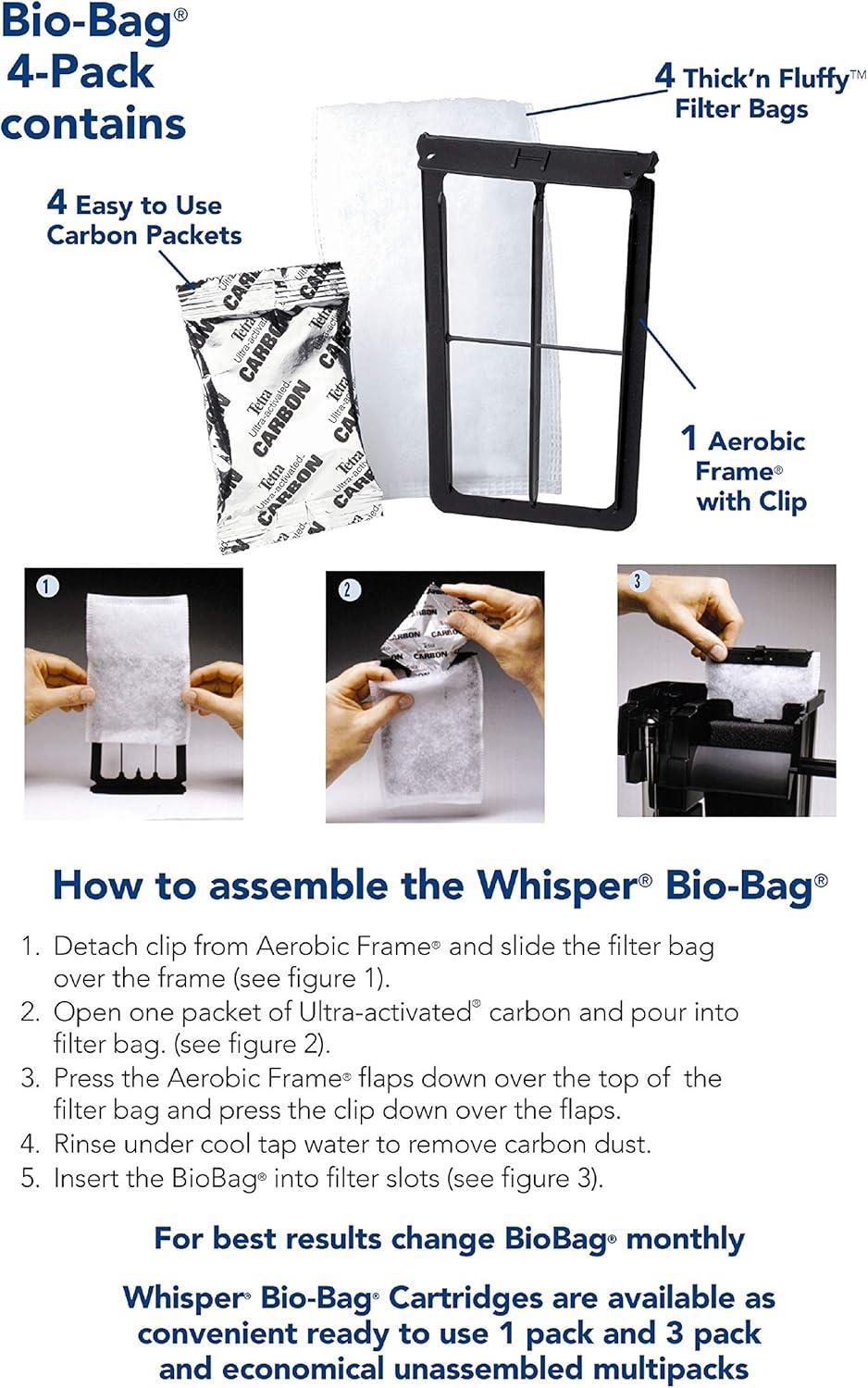 For 50 years, fishkeeping enthusiasts have looked to the Tetra name for products and solutions that add ease and beauty to their home. Whether you're an experienced hobbyist or just starting out, Tetra has everything you need–-from a large variety of quality fish food and innovative equipment to test kits and decor. Whisper Bio-Bag Cartridges complete the Whisper Power Filter package for a clean, easy-to-maintain aquarium. The Whisper Bio-Bag multi-packs come unassembled and offer economical pricing on larger quantities. Simply detach clip from Aerobic Frame and slide the filter bag over the frame. Add one packet of Ultra-activated carbon. Press the Aerobic Frame flaps down over the top of the filter bag and press the clip down over the flaps. Rinse under cool tap water to remove carbon dust. Insert the Bio-Bag into filter slots. For best results change the Bio-Bag monthly. Fits: Small-3i Internal Medium- PF10 Power Filter, 10i Internal and Reptofilter 90 GPH Large- 20, 30,40 and 60 Power Filters and 20i & 40i Internals XL-Whisper 4 and 5, TetraTec 300 and 500