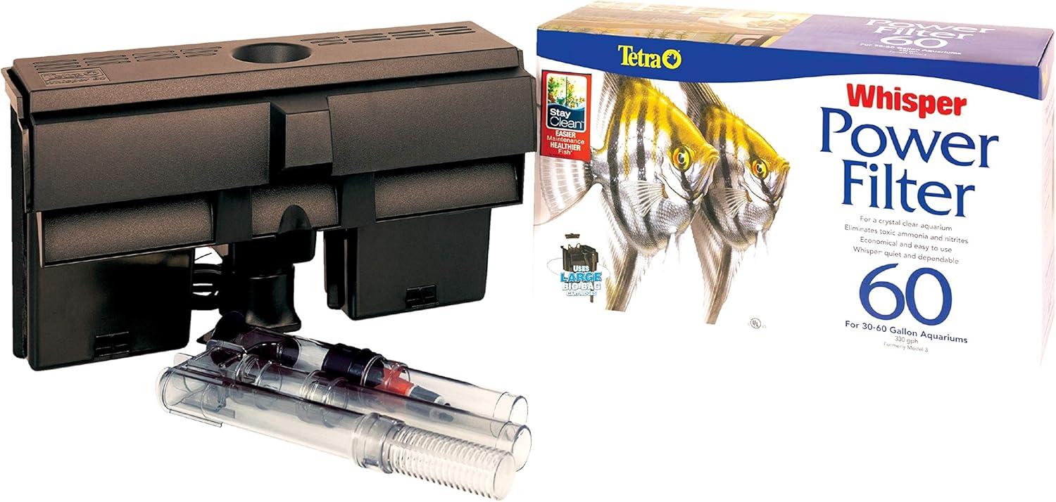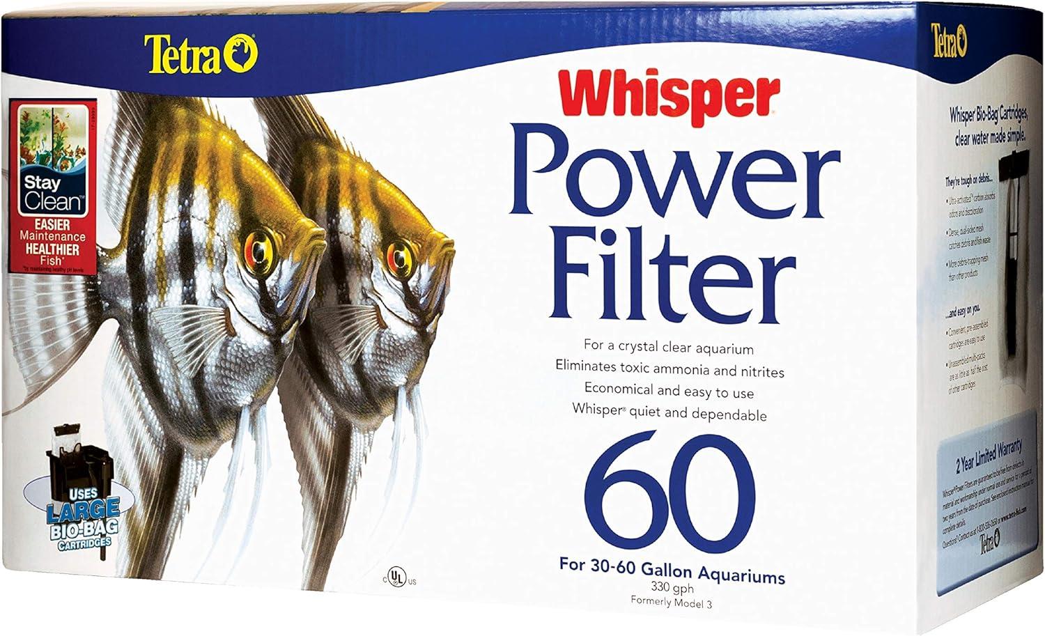 The Tetra® Whisper® Power Filter for aquariums offers quiet, 3-stage filtration for clean water and healthy fish. Dual-sided mesh catches debris and fish waste in its dense, fibrous network, then Ultra-Activated™ carbon provides chemical filtration by absorbing odors and discoloration. Biological filtration is provided by Bio-Foam®, which creates a large, three-dimensional area for cultivating aerobic bacteria, which eliminate toxic ammonia and nitrites. No moving parts means long-term reliability. Uses Stay Clean™ technology to help keep your aquarium clean, clear and healthy, reduce buildup on aquarium glass and bind small dirt particles to make them easier to filter. This filter uses easy-to-change Tetra Whisper Bio-Bag® Cartridges (size large), which trap particles floating in your aquarium. The Tetra Whisper Power Filter 60 treats aquariums up to 60 gallons (330 GPH). Since 1951, Tetra has developed the world’s most comprehensive body of fish food knowledge, and fishkeeping enthusiasts have looked to the brand for products and solutions that add ease and beauty to their home. Whether you're an experienced hobbyist or just starting out, Tetra has everything you need – from a large variety of quality fish food and innovative equipment to test kits and decor.