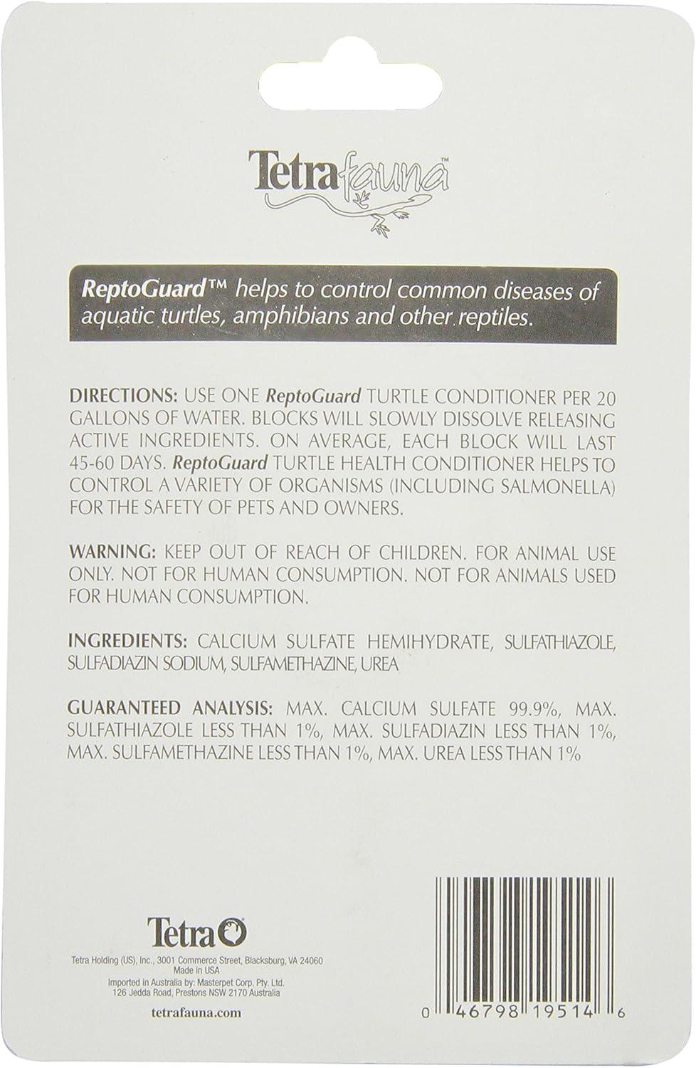 TetraFauna ReptoGuard Turtle Health Conditioner is a slow-dissolving conditioner that helps to create a healthier environment for aquatic turtles as well as amphibians and other reptiles The slow-release medicated sulfa blocks help to control for a happy turtle TetraFauna ReptoGuard Turtle Health Conditioner helps to control a variety of organisms including salmonella for the safety of pets and owners Each unique turtle-shaped block treats up to 20 gallons of water and lasts up to 2 months Use one TetraFauna ReptoGuard Turtle Health Conditioner block per 20 gallons of water Each block will slowly dissolve releasing the active ingredients continuously for up to 60 days Use with TetraFauna AquaSafe For Reptiles & Amphibians which neutralizes harmful chlorine chloramines and heavy metals such as copper iron and zinc in tap water and contains colloids that protect turtle skin TetraFauna products are trusted by pet owners to meet the needs of their exotic animals Since 1951 Tetra has developed the world’s most comprehensive body of fish food knowledge and fishkeeping enthusiasts have looked to the brand for products and solutions that add ease and beauty to their home Whether you're an experienced hobbyist or just starting out Tetra has everything you need – from a large variety of quality fish food and innovative equipment to test kits and decor