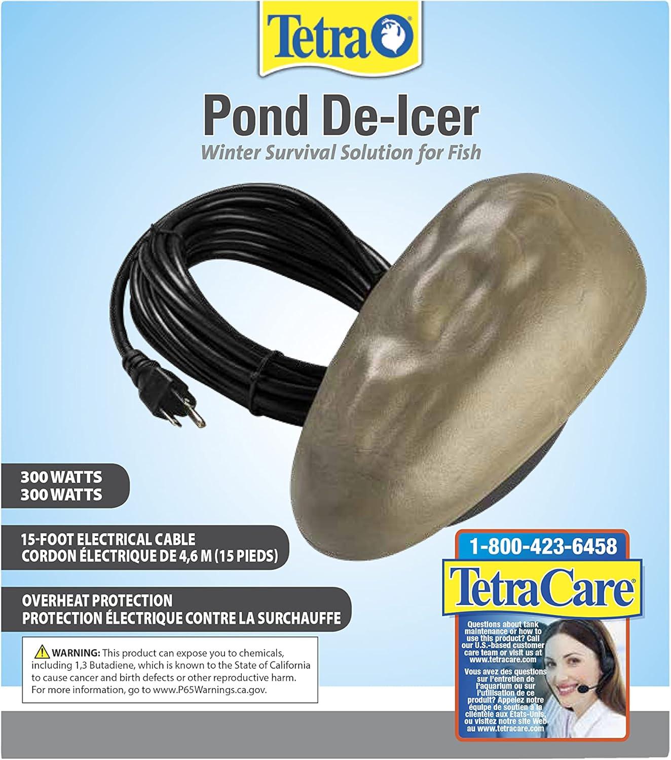 For 50 years, fishkeeping enthusiasts have looked to the Tetra name for products and solutions that add ease and beauty to their home. Whether you're an experienced hobbyist or just starting out, Tetra has everything you need–-from a large variety of quality fish food and innovative equipment to test kits and decor. In cold weather, toxic gases caused by decaying matter and fish waste can become trapped under the ice by releasing harmful pond gases. The TetraPond De-Icer helps release harmful pond gases by keeping an area of the pond ice-free. It features include a natural stone finish that blends in with your ponds surroundings. This product is 300 watts. Energy-efficient thermostat control shuts off power when not needed. UL listed. Effective to – 20°F (-28.8°C). 15 foot cord. The TetraPond De-Icer helps fish stay healthy all winter long making it your winter survival solution for fish!