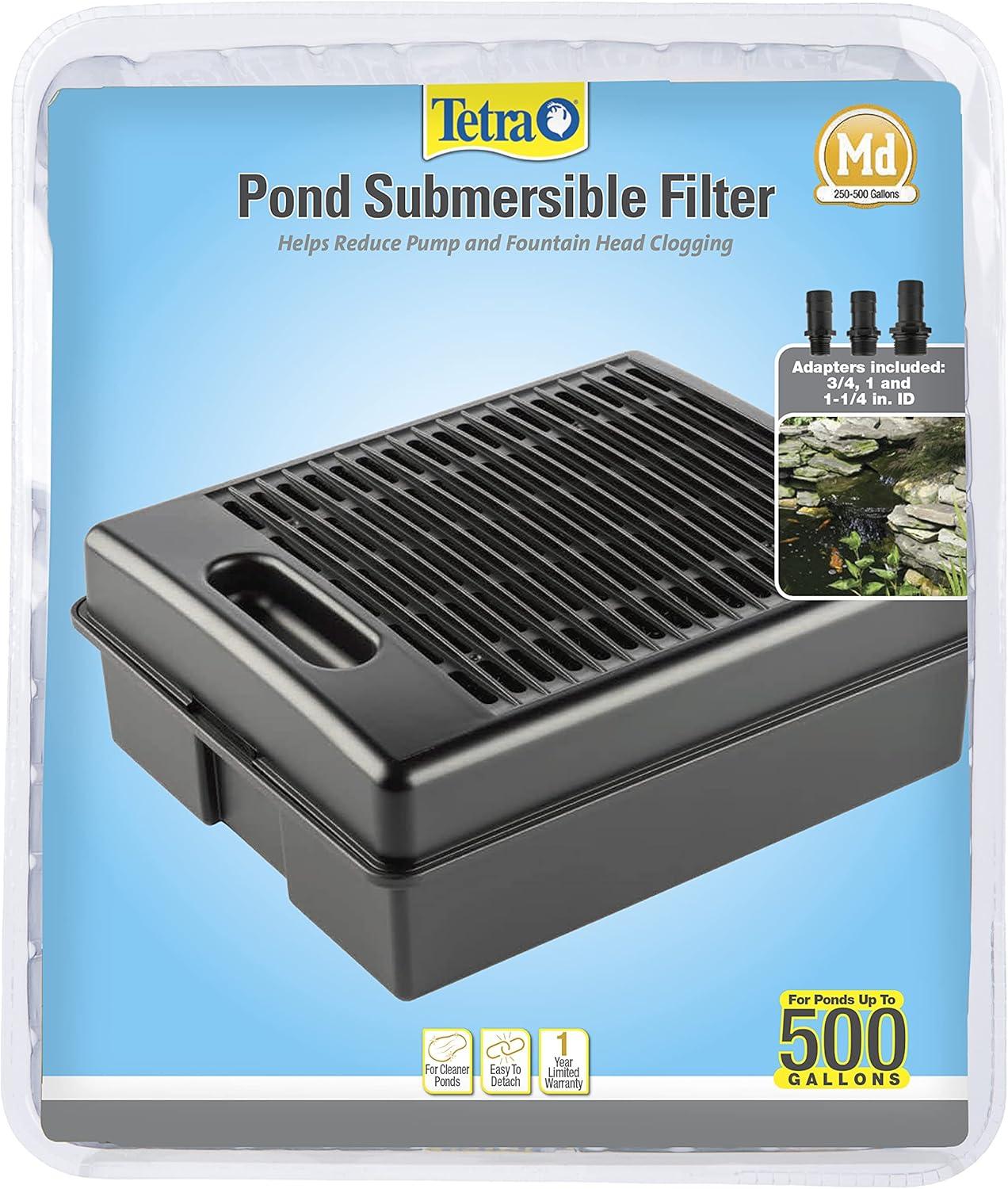 For 50 year, fishkeeping enthusiasts have looked to the Tetra name for products and solutions that add ease and beauty to their home. Whether you're an experienced hobbyist or just starting out, Tetra has everything you need–-from a large variety of quality fish food and innovative equipment to test kits and decor. The TetraPond Submersible Flat Box Filter keeps ponds clean and prevents pump and fountain heads from clogging. Clean your pond water of dirt and debris with the Flat Box Filter. It includes a flat filter box with filter-to-hose fitting, coarse and fine foam pads, 1″ tubing, and three fittings for attaching hose to various pump inlets. Fits a wide variety of pumps, 200 to 2000 GPH. Make your pond the focal point of your outdoor space by keeping it clean and clear. Pair a waterfall filter with other TetraPond products to create a pond feature that reflects your personality and style. Amazon.com Clean and Healthy Water The TetraPond Submersible Flat Box Filter efficiently clears your pond of dirt and debris. This unique design helps to reduce pump and fountain clogging and fits many different pond pumps. The Submersible Flat Box Filter is easy to open and clean and features a 1 Year Limited Warranty. How it Works Water is drawn into the flat box filter. Water passes through a coarse and a fine foam mat, removing particles. Water is drawn into the pump. Clean water is discharged into the pond through the fountain or waterfall. Fountains and waterfalls provide beneficial aeration to the pond. What's in the Box Filter Box Filter Pads (coarse and fine foam) Tubing (12″ x 1″ internal diameter) Filter-to-Hose Fittings (1″ thread w/ 1″ hose barb) Tubing Fittings for connecting to pump inlet: 3/4″ male thread w/ 1″ hose barb; 1″ male thread w/ 1″ hose barb; 1-1/4″ male thread w/ 1″ hose barb More Great Pond Products Koi Vibrance, Goldfish Multi Mix, Pond Sticks, Pond Flakes, Vacation Food 5 watt, 9 watt, 18 watt, 36 watt AquaSafe, Filter Starter, Water Clarifier, KoiVital, Sludge Reducer, Algae Control Water Garden Pump, ClearChoice BioFilter, BioActive Pressure Filter, Flat Box Filter, Waterfall Filter